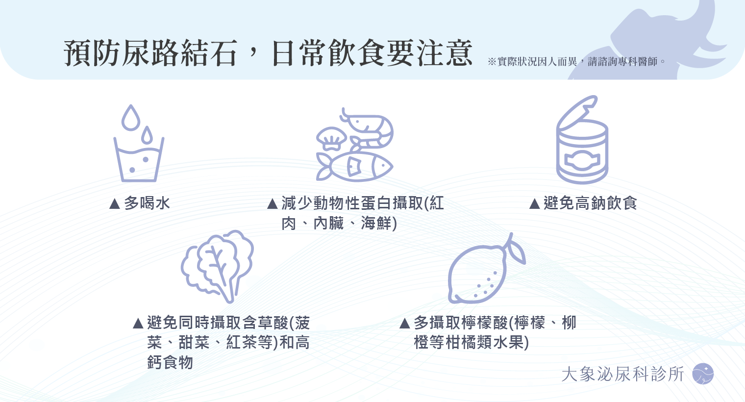 ☑︎飲食習慣:飲食太精緻、太鹹或含鈣量過高,嗜食豆類製品、菠菜等蔬菜或動物內臟、海鮮類攝取過多可能會增加結石的風險。