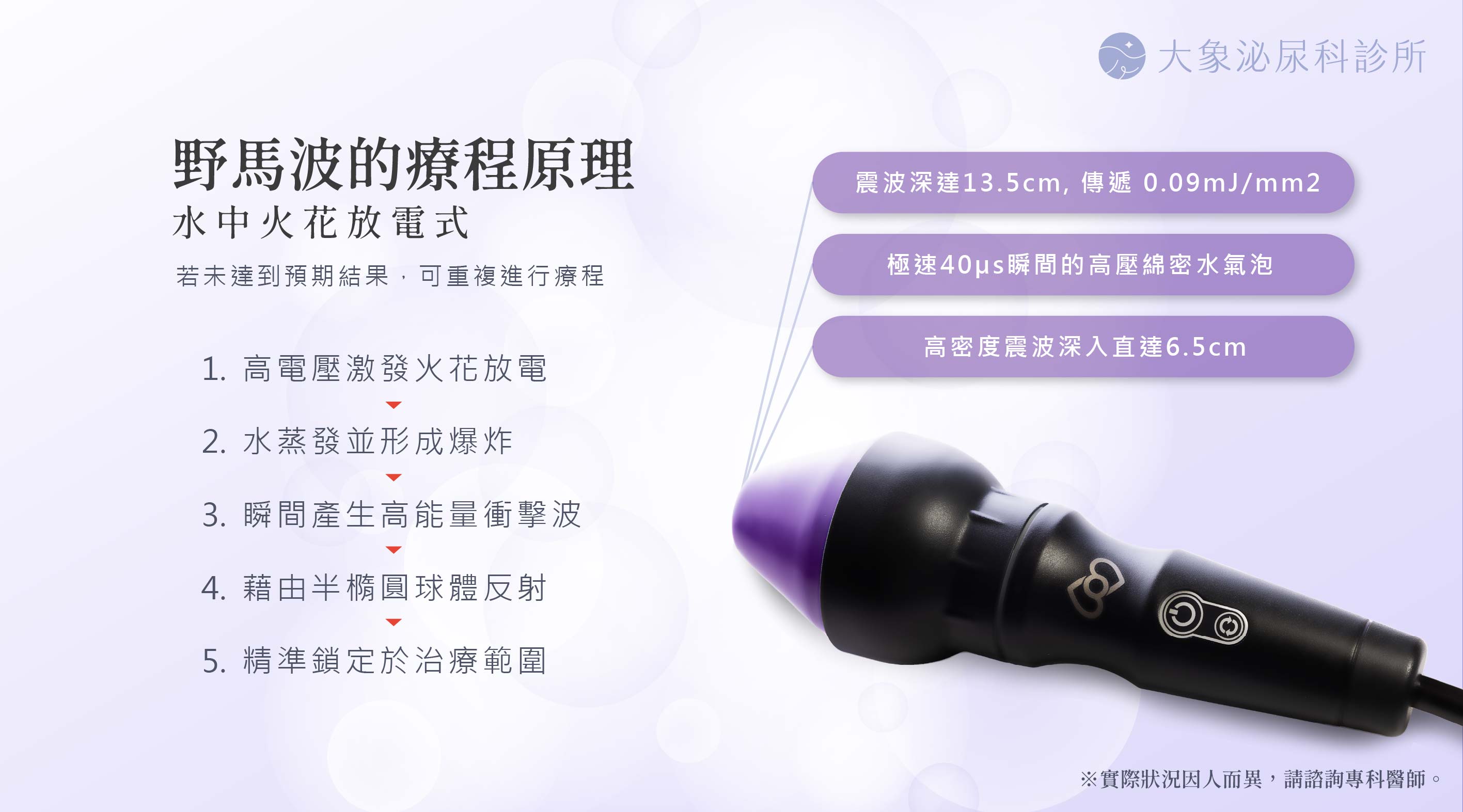 技術上,野馬波的震波穿透深度可達13.5公分,能量輸出達0.09 mJ/mm²,並於40微秒內產生高壓氣泡震波,使高密度能量得以深入組織層達6.5公分。這樣的物理刺激能有效促進局部循環,修復受損血管與神經,從根源改善勃起功能。