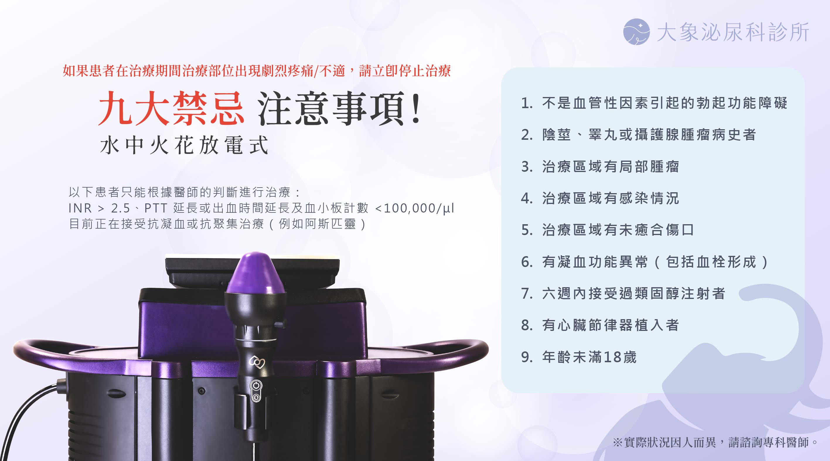 針對目前正在使用抗凝血或抗血小板藥物(例如阿斯匹靈)、INR值超過2.5、PTT或出血時間延長、血小板計數低於100,000/μl等患者,需經由專科醫師評估後,才能決定是否適合進行治療。治療期間若出現局部劇烈疼痛或不適,應立即停止療程並聯繫醫師。建議所有患者在療程前與醫療團隊充分溝通,依照個人健康狀況進行審慎評估,確保治療安全且有效。