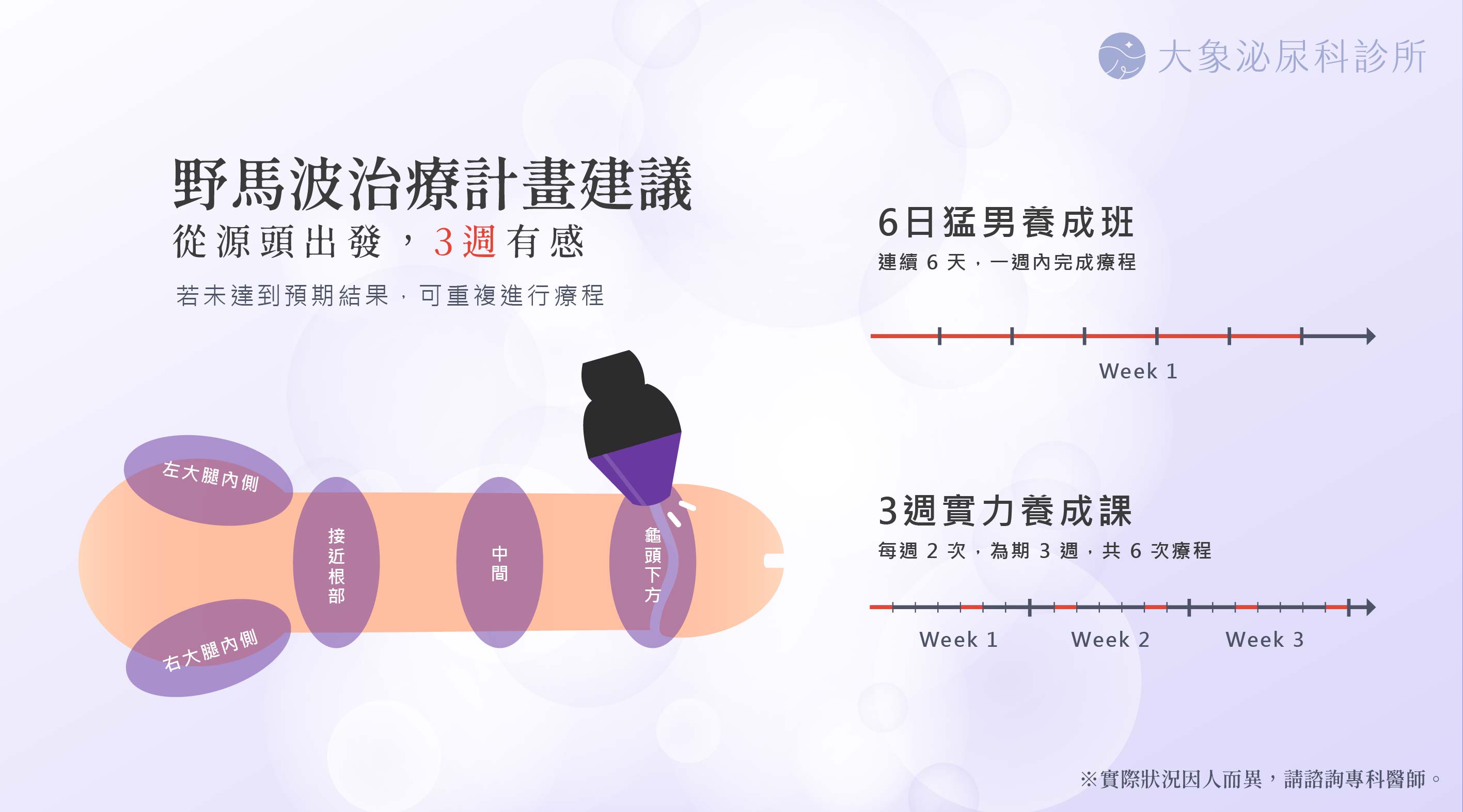 針對不同生活型態與恢復目標,野馬波治療可依醫師建議安排兩種療程規劃:若希望在短期內快速改善,建議選擇「6日猛男養成班」,連續6天進行治療,效果集中,適合需迅速重建信心的男性。而「3週實力養成課」則採每週2次,連續3週共6次的療程步驟,更適合講求穩定重建、漸進修復的族群。