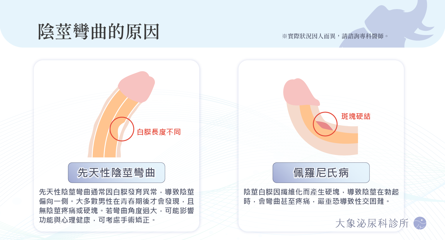 ▸先天彎曲:先天性的原因多半是因為白膜在發育的時候因為某些不明的原因,造成發育的速度不同而使陰莖偏向某一邊。多數進入青春期之後的男性才會發現,而且通常沒有陰莖疼痛的病史,觸摸陰莖也不會發現有任何異常的硬塊,若彎曲角度過大,恐影響其功能和心理健康,可考慮手術矯正。