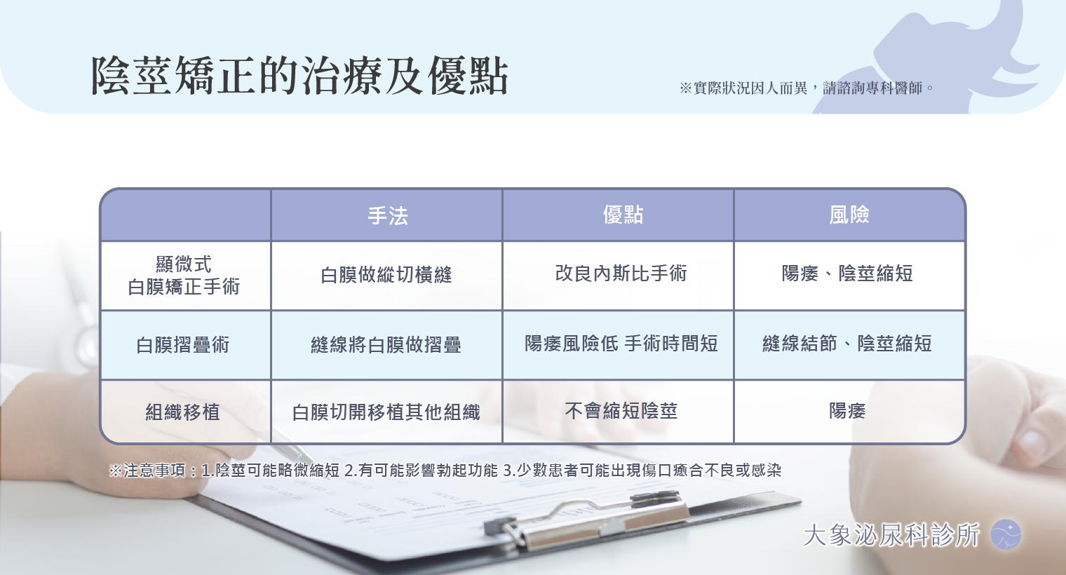 ➀ 白膜摺疊術(Plication):將陰莖較長的一側縫合縮短,使兩邊長度平衡,適合輕中度彎曲者,手術時間較短,恢復較快。